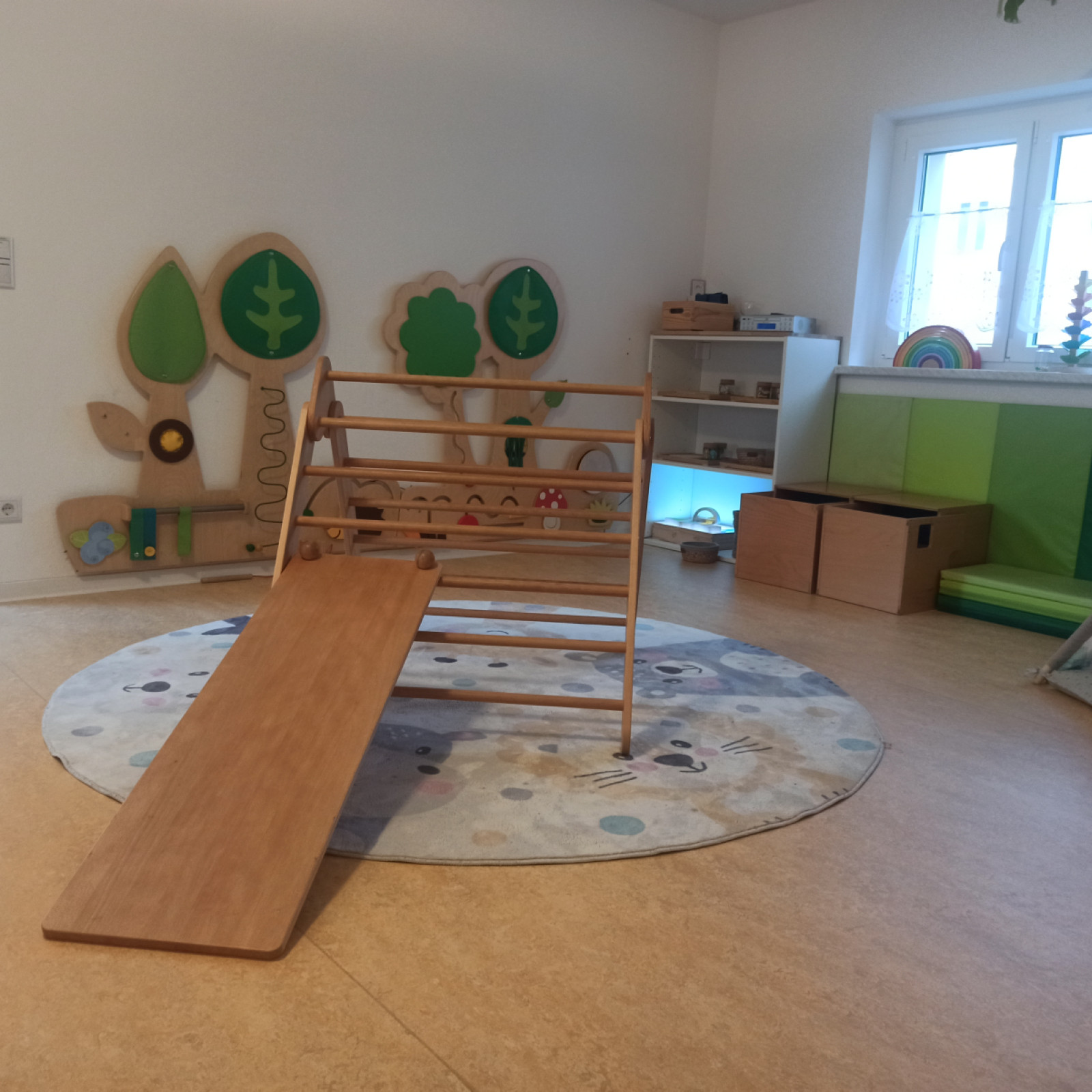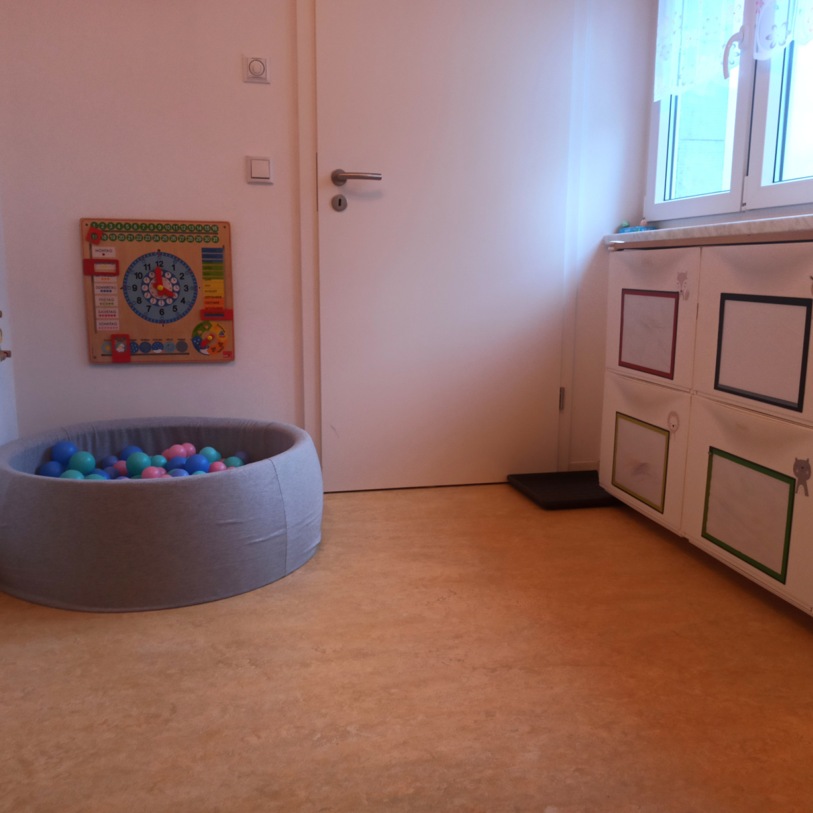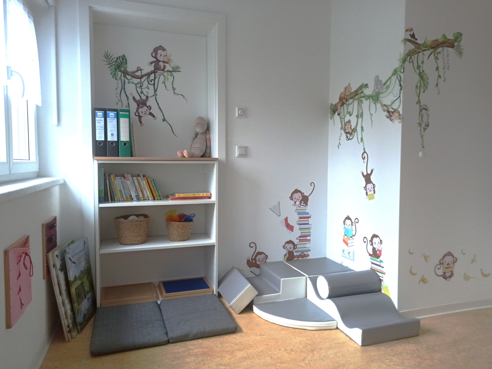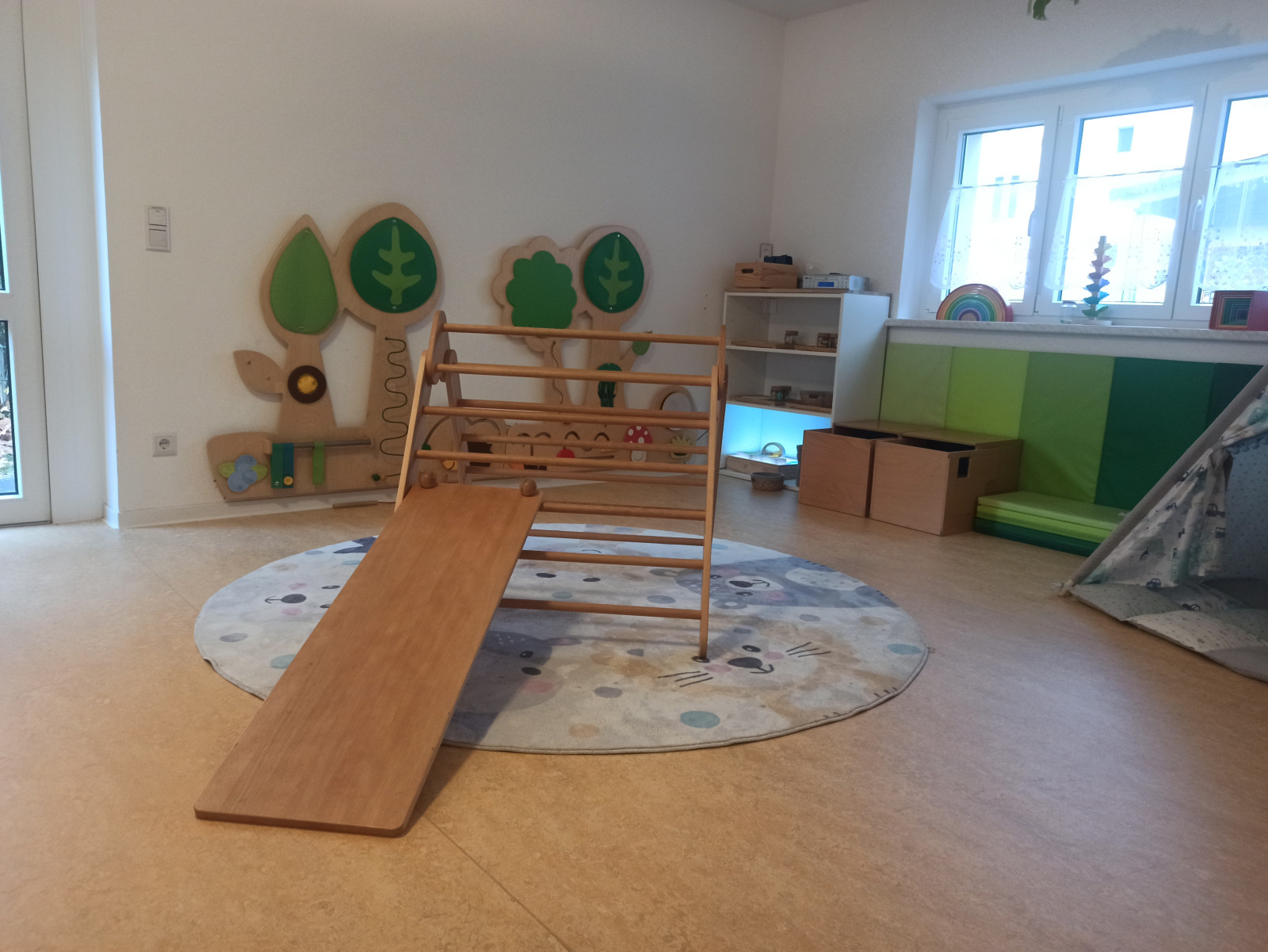 In unserem Spielzimmer finden unterschiedliche Materialien für individuelle Sinneswahrnehmungen ihren Platz. An der Sinneswand können die Kleinsten erste Erfahrungen sammeln und bereits physikalische Gesetzmäßigkeiten kennenlernen. Gezielt ausgewähltes Montessori-Material ist für die Kinder jederzeit frei zugänglich. Beim Arbeiten mit diesem steht jedem Kind eine Matte in dessen Farbe zur Verfügung, welche den Arbeitsbereich symbolisiert und ein ungestörtes und intensives Arbeiten und Vertiefen der gewonnenen Erkenntnisse ermöglicht.