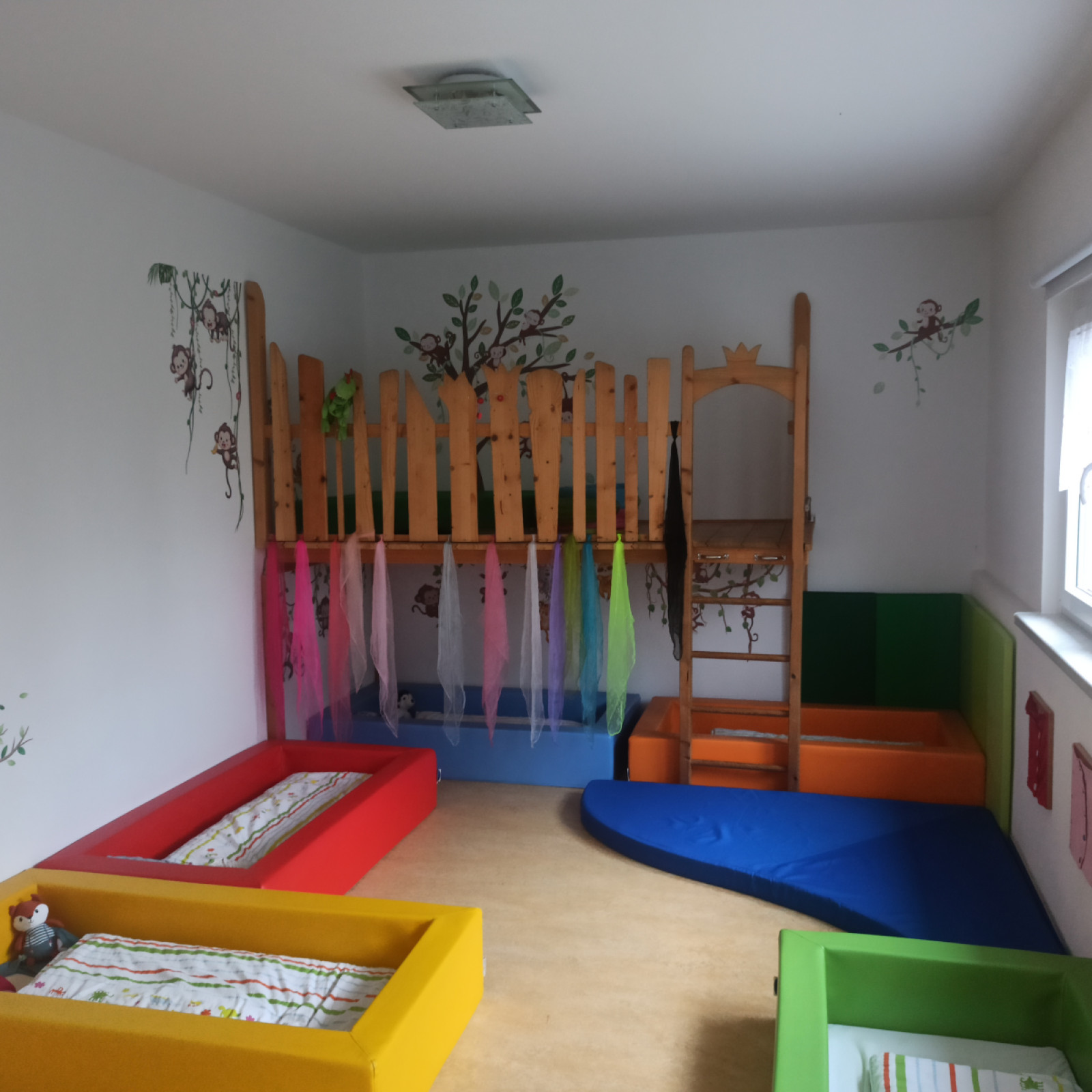 In unserem Schlafraum hat jedes Kind sein eigenes Schaumstoff-Matratzenbett in seiner Farbe. Diese ermöglichen das selbstständige Ein- und Aussteigen und geben somit mehr Freiraum, Dank des erhöhtem Randes dennoch genügend Geborgenheit und Sicherheit. Die Betten werden außerhalb der Mittagsruhe gestapelt, sodass der Raum ausreichend Platz für Bewegung bietet.