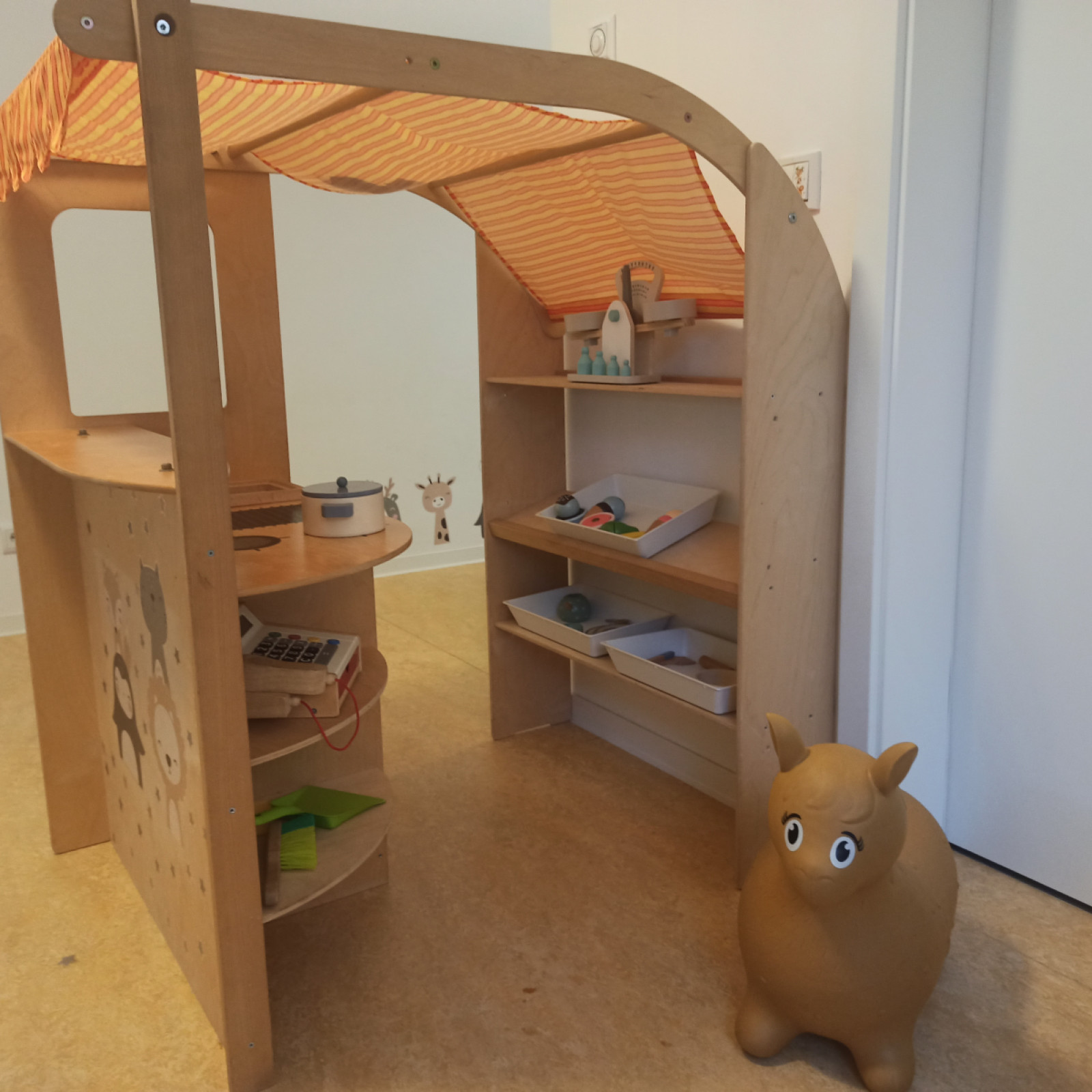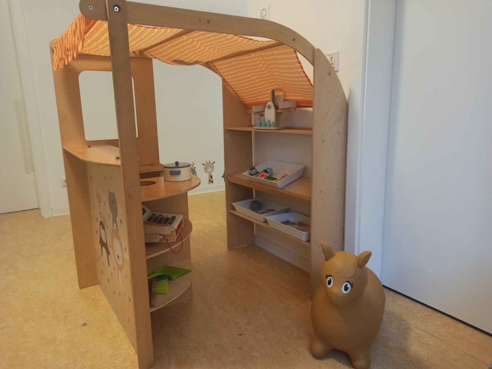 In der Kinderküche, der Puppenecke und mit den Baufahrzeugen haben die Kinder die Möglichkeit, ersten Nachahmungs- und Rollenspielen nachzugehen.