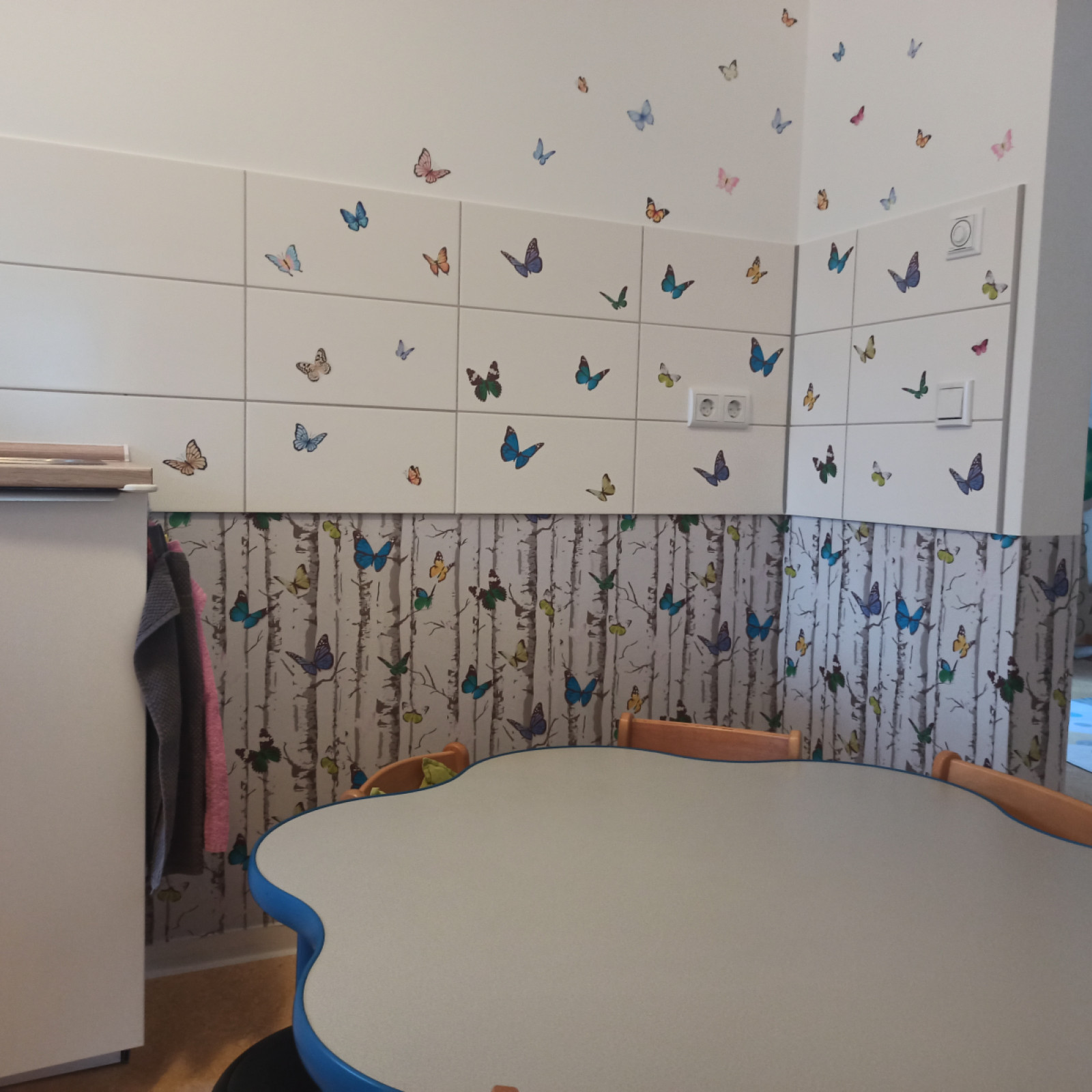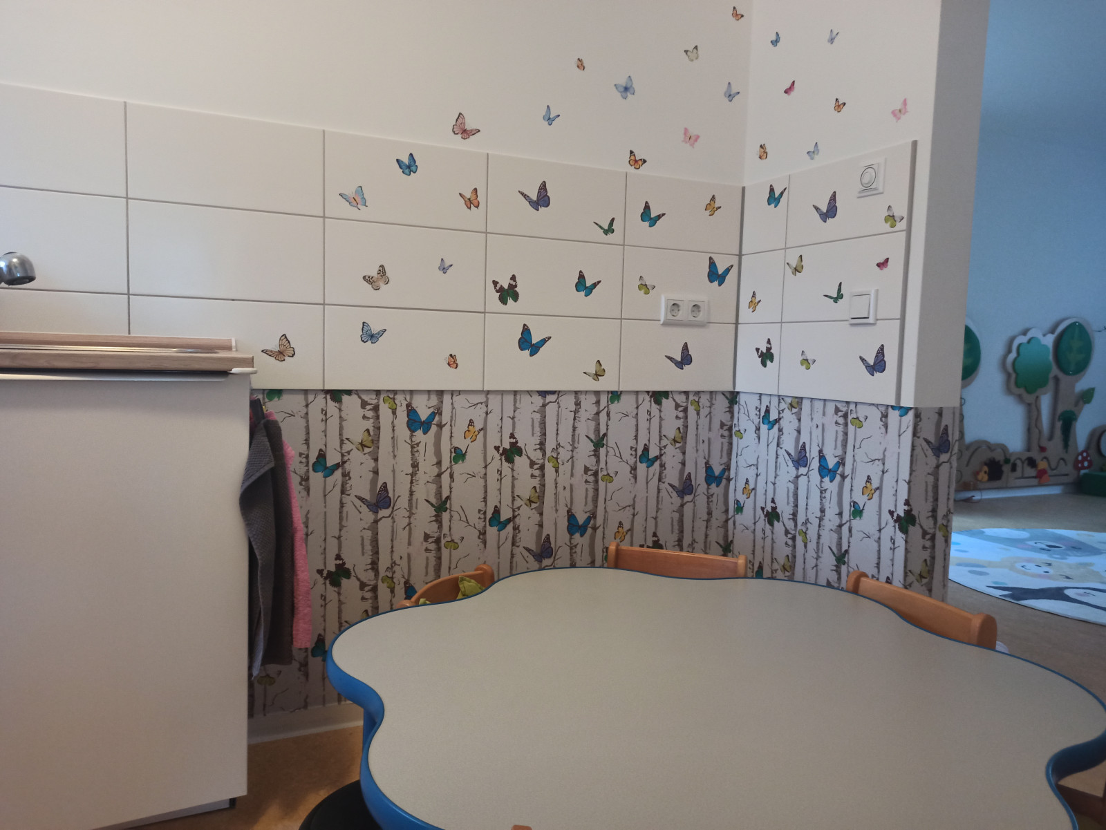In unsere Küche nehmen wir alle Mahlzeiten zu uns. Das Frühstück und Vesper bereite ich mit den Kindern frisch zu, das Mittagessen bekommen wir von einem Kinderkoch frisch zubereitet und geliefert. Die Kinder helfen beim Tischdecken, das Porzellangeschirr, die Gläser und das Edelstahlbesteck ist für die Kinder frei zugänglich.